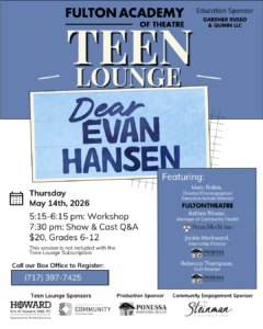 Attend a special behind-the-scenes workshop with professional theatre artists from the current Fulton Theatre Mainstage production. Gain insights about the show and the unique challenges the team faced mounting it. Topics for each Teen Lounge revolve around featured moments from the production such as actors from the show, music, choreography, set design, costumes, and other theatrical design elements.